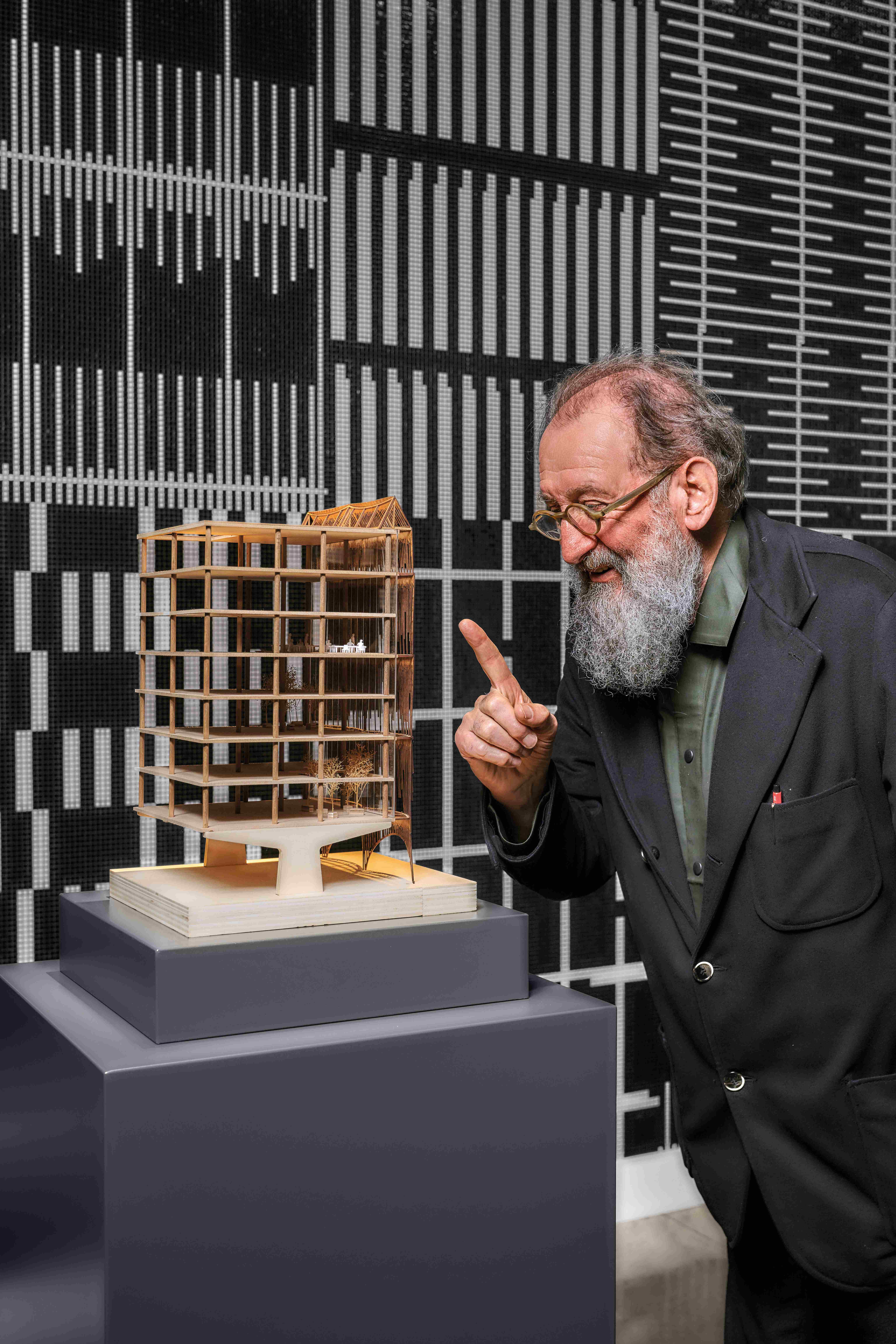 Six wooden models of the studio's iconic projects and two Produzione Privata © modular screens complete the installation. They vividly showcase the "permeable wall" concept, blending lights and darks, natural and artificial light, connecting the spaces and those who live them.